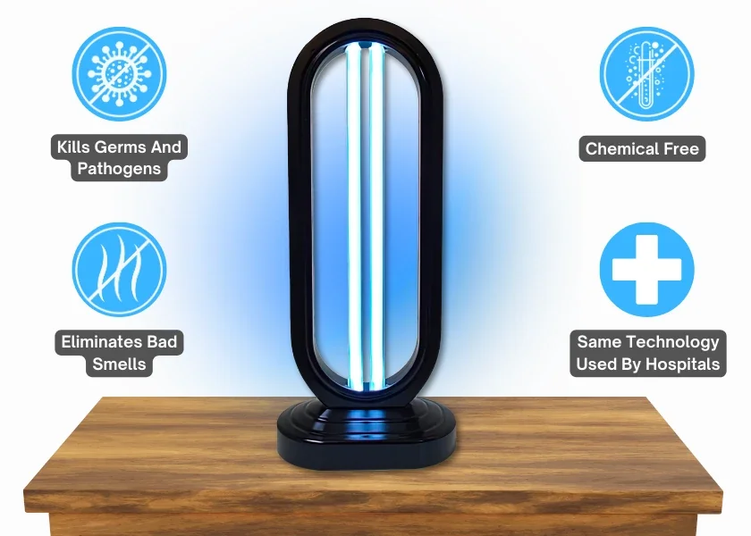 Sterilightzer Lamps harness the power of both UV-C light and Ozone for comprehensive air and surface sanitation throughout a room.